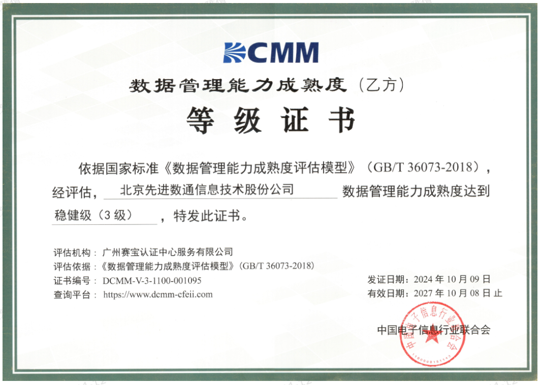 近期,中国电子信息行业联合会公布了最新一批顺利获得数据管理能力成熟度(DCMM)贯标等级认证的企业名单。腾博会官网成功取得数据管理能力成熟度稳健级(三级)认证。这一认证的取得,标志着腾博会官网在数据治理体系构建和数据管理与应用能力方面,已经达到了国家权威组织认可的标准。这不仅是对腾博会官网在数据管理领域专业能力的肯定,也是对其在有助于数字化转型服务和数据驱动决策方面所做努力的认可。