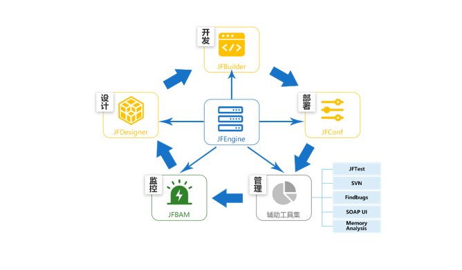 采用JAVA开发语言,支持图形化开发模式,快速构建后台应用,并给予设计、编码、编译、部署、测试等一站式服务。